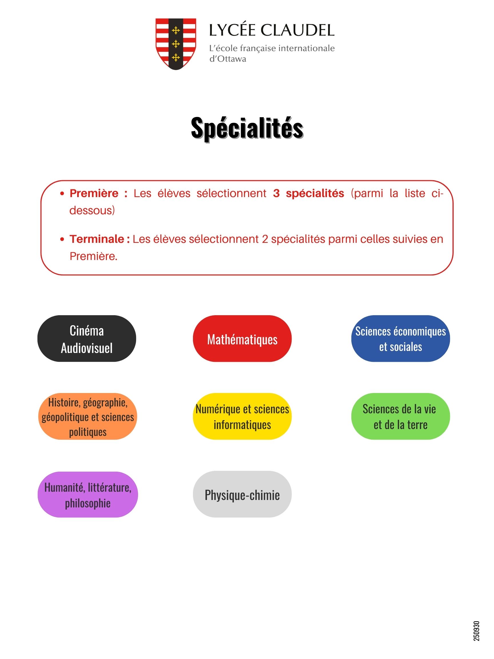 At the end of Seconde, students choose a combination of three specialties to follow in Première (4 h per week per specialty) and up to two options from among Latin and Audiovisual Cinema.